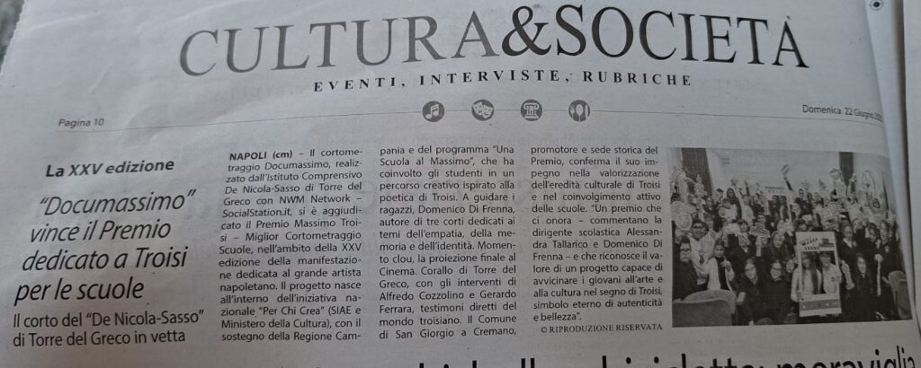 Proprio oggi, tra le somme del mio lavoro, raccolgo le idee per raccontare di “Documassimo”, il cortometraggio che ha vinto il Premio Massimo Troisi 2025 nella categoria Miglior Cortometraggio Scolastico, realizzato con l’I.C. De Nicola Sasso di Torre Del Greco.