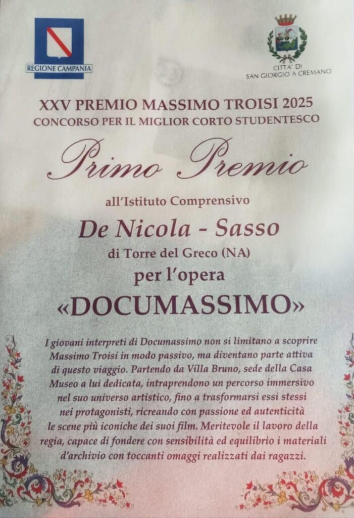 Proprio oggi, tra le somme del mio lavoro, raccolgo le idee per raccontare di “Documassimo”, il cortometraggio che ha vinto il Premio Massimo Troisi 2025 nella categoria Miglior Cortometraggio Scolastico, realizzato con l’I.C. De Nicola Sasso di Torre Del Greco.