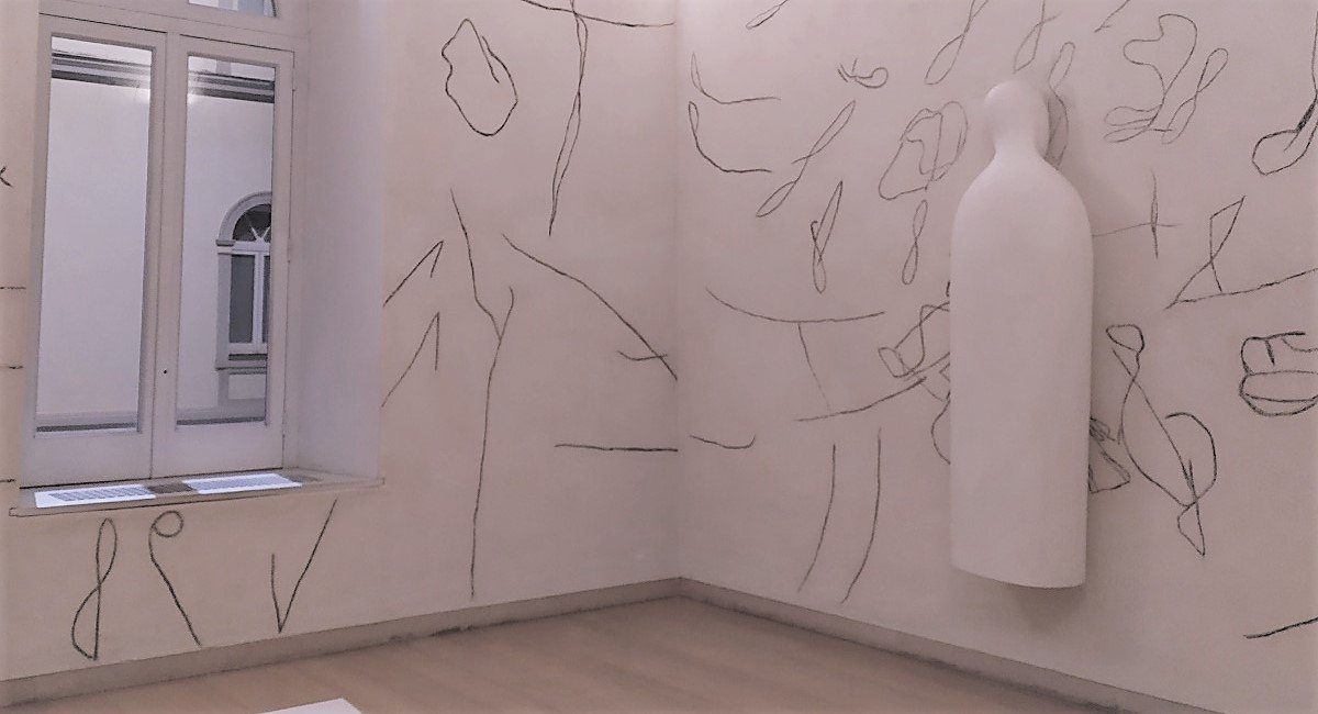 Nella sala al Madre l’insieme formato dai segni graffiati sulla superficie grezza delle pareti e la scultura nello spazio assumono un rilievo ambientale che immerge lo spettatore in una totalità infinita.