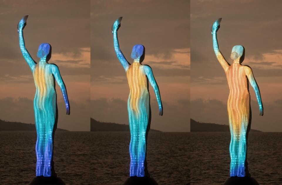 Inoltre, il MOUA si compone anche di una sola opera posta sopra la superficie dell’acqua dell’lungo mare di Townsville, sorretta su un palo. Si tratta dell’Ocean Siren, una scultura ricoperta da LED che cambiano colore in base alla temperatura dell’oceano. Più c’è freddo più la luce virerà sui colori del blu e del viola, più è caldo più le luci si tingeranno si arancione e di rosso.