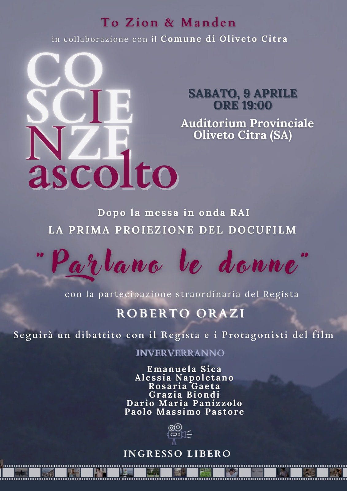 Sabato 9 Aprile, alle ore 19, nell’ Auditorium provinciale di Oliveto Citra in provincia di Salerno, si terrà l’evento Coscienze in ascolto – Proiezione del docufilm “Parlano le donne”.