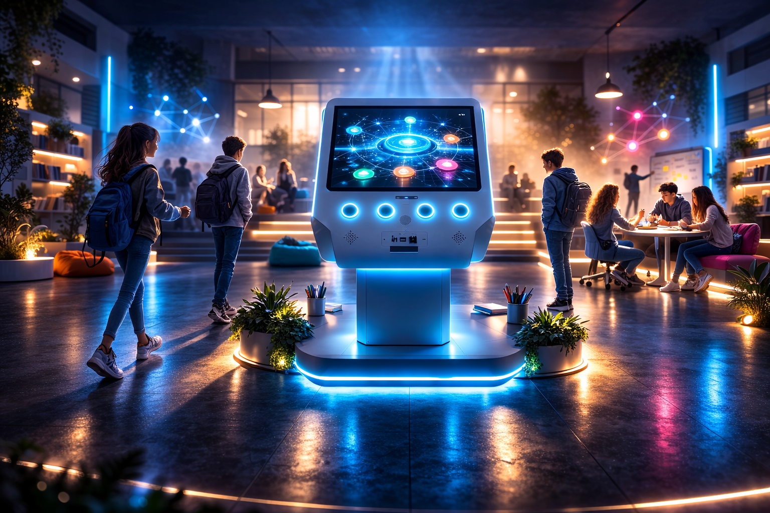 Un totem interattivo con desk cooperativo progettato per essere utilizzato da più persone contemporaneamente. La tecnologia diventa così un facilitatore di relazione, non un sostituto delle relazioni umane.
